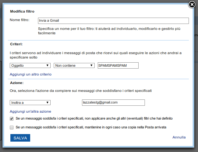 Ovviamente modificate gli indirizzi con i vostri. Il trucco è di impostare un criterio ragionevolmente impossibile (ovvero l’oggetto del messaggio contiene SPAMSPAMSPAM) e poi agire se il criterio non viene soddisfatto, in questo modo di fatto tutti i messaggi vengono inoltrari, anche s sono stati inviati in CCN o tramite mailing list.