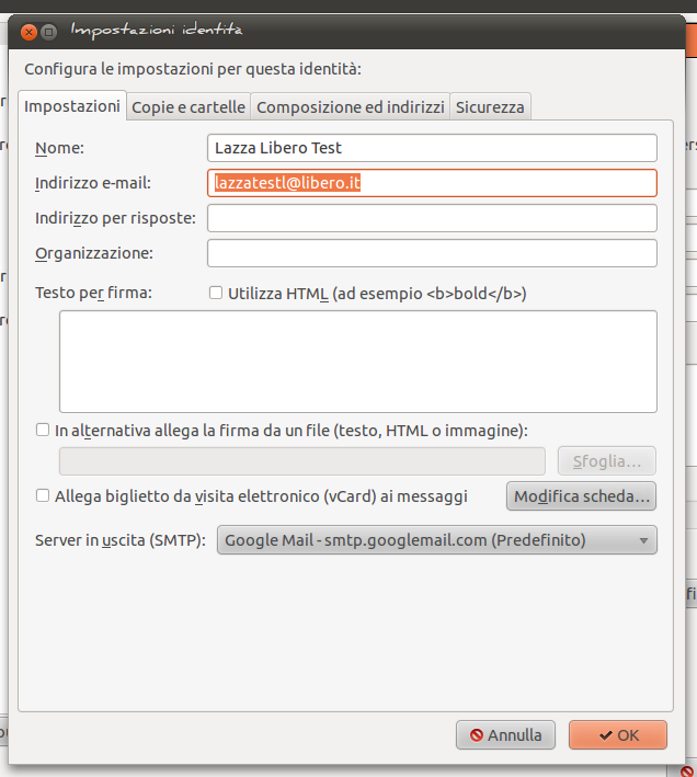 Sono riuscito a far funzionare tutto correttamente, ho solo un problemino.. non riesco a settare mail (v 5.2) per inviare con l’indirizzo di libero, come invece è ben spiegato per thunderbird: non trovo niente di simile a “gestione identità..” dici che c’è modo?