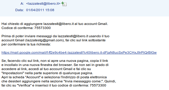 È sufficiente cliccare sul link di conferma per abilitare l’invio. Vi consiglio poi di tornare nelle impostazioni di Gmail (stessa scheda) per controllare che risulti attivato l’indirizzo, e poi cliccate su “Rispondi dallo stesso indirizzo al quale il messaggio è stato inviato” per usarlo automaticamente anche nelle risposte alle mail mandate a Libero che tra poco potrete far arrivare in Gmail.