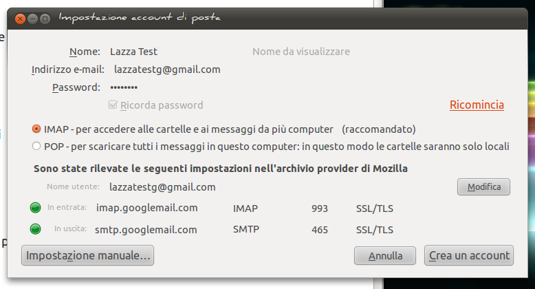 mx1.gmail.it(un server di posta della versione “tarocca” di Gmail). Assicurati di usare una vera casella di Gmail (le quali terminano sempre e solo con gmail.com o googlemail.com). Se stai usando davvero una casella Gmail di Google, allora proprio non riesco a capire come mai compaia quel server. 😯trovato l’errore, avevo sbagliato a scrivere l’indirizzo gmail