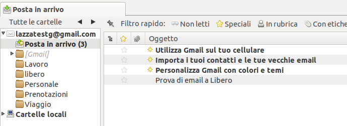 Potete notare sulla sinistra che le etichette in Gmail vengono convertite in cartelle IMAP. In questo modo, considerando di avere già il filtro in Gmail, basta aprire la cartella di Thunderbird per avere i messaggi filtrati. Tuttavia, potrebbe tornare utile usare anche le etichette di Thunderbird, le quali permettono di colorare i messaggi per un ulteriore riscontro visivo (e possibilità di ricerche filtrate).