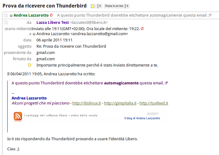 Come vedete nella figura il server che ha inviato il messaggio è quello di Gmail, mentre l’indirizzo mittente è quello di Libero, quindi funziona.