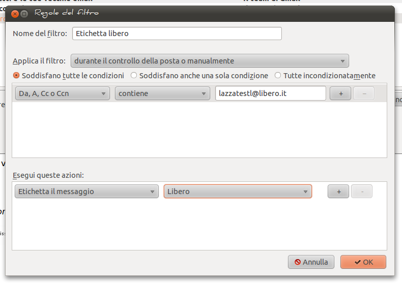 Questa cosa è utile specialmente se non usate l’account Gmail solo come “ponte” ma anche per altri messaggi con l’indirizzo vero. Nelle impostazioni potete creare un filtro Gmail per etichettare automaticamente i messaggi Libero e distinguerli visivamente dagli altri. La cosa si rivela utile anche per l’utilizzo IMAP, come vedremo poi.