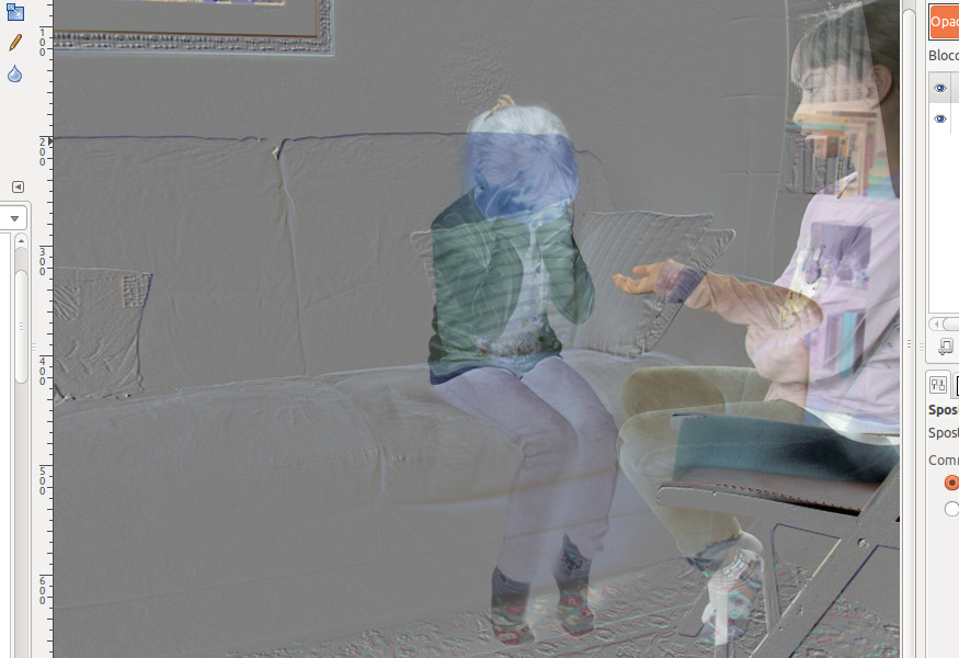 Una volta visualizzata la situazione, bisogna utilizzare lo strumento di spostamento per muovere il livello superiore fino a che i bordi sono più allineati possibile, con particolare attenzione alle aree vicine alla persona (altrove non è necessaria troppa precisione):