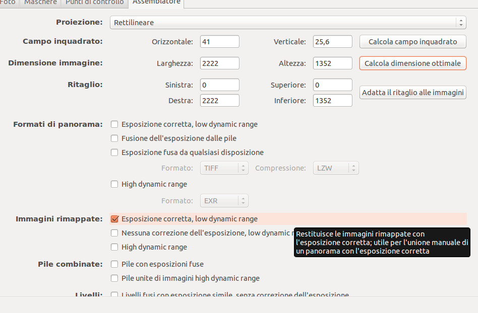 Solo due appunti: con hugin io non ho utilizzato la fotometria altrimenti le immagini diventavano troppo buie; inoltre alla fine ho cliccato su calcola campo inquadrato e non su calcola dimensione ottimale, altrimenti le dimensioni diventavano esageratamente grandi ( gigapixel)