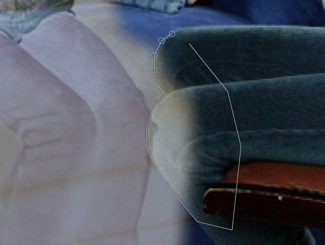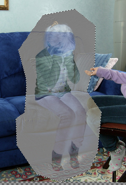 A questo punto è necessario usare una selezione abbastanza approssimativa intorno alla persona nella sua nuova posizione e anche agli oggetti che si sono mossi, come ad esempio il cuscino del divano che si è abbassato leggermente. Create questa selezione con lo strumento di selezione lazo, poi fate Ctrl+I per invertire la selezione e premete il tasto Canc: