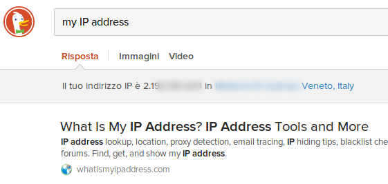 Vediamo un esempio semplice: supponiamo di voler verificare qual è l’indirizzo IP della nostra connessione ad Internet. Ci sono numerosi siti che consentono di farlo, quindi possiamo scrivere la seguente query in un motore di ricerca: