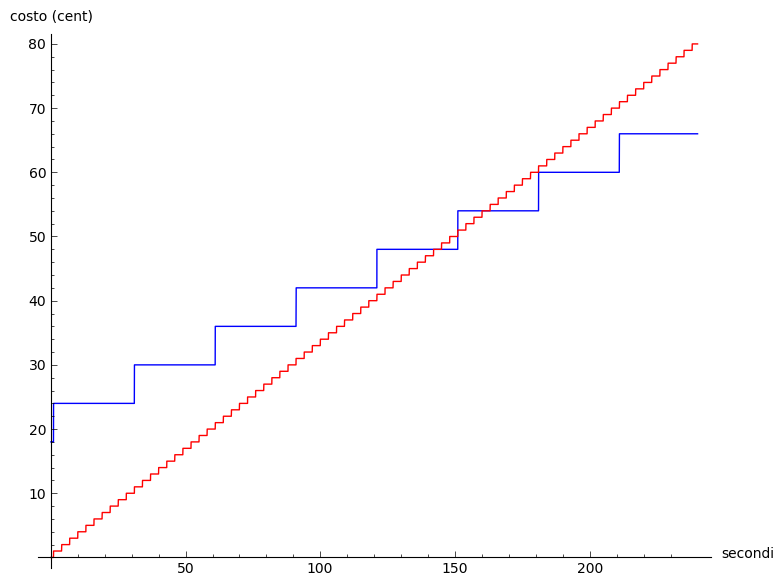 Partiamo dal principio: per gli SMS si vede subito che costano meno, ma quello poco importa visto che TIM Young dà 1000 SMS al mese inclusi nel prezzo, quindi ci interessano le chiamate. La prima cosa da fare è definire due funzioni per rappresentare le tariffe. Sage ci permette di definire e rappresentare su un grafico funzioni completamente arbitrarie, ma non solo cose del tipo 3x²+sin(x), bensì vere e proprie funzioni programmate in Python (anzi, nel linguaggio esteso di Sage). Ecco il codice per i due piani: