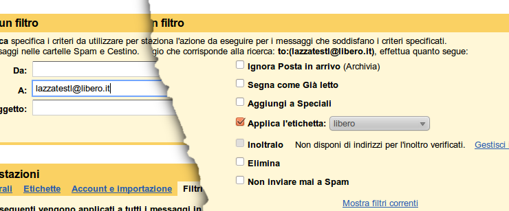 Questa cosa è utile specialmente se non usate l’account Gmail solo come “ponte” ma anche per altri messaggi con l’indirizzo vero. Nelle impostazioni potete creare un filtro Gmail per etichettare automaticamente i messaggi Libero e distinguerli visivamente dagli altri. La cosa si rivela utile anche per l’utilizzo IMAP, come vedremo poi.