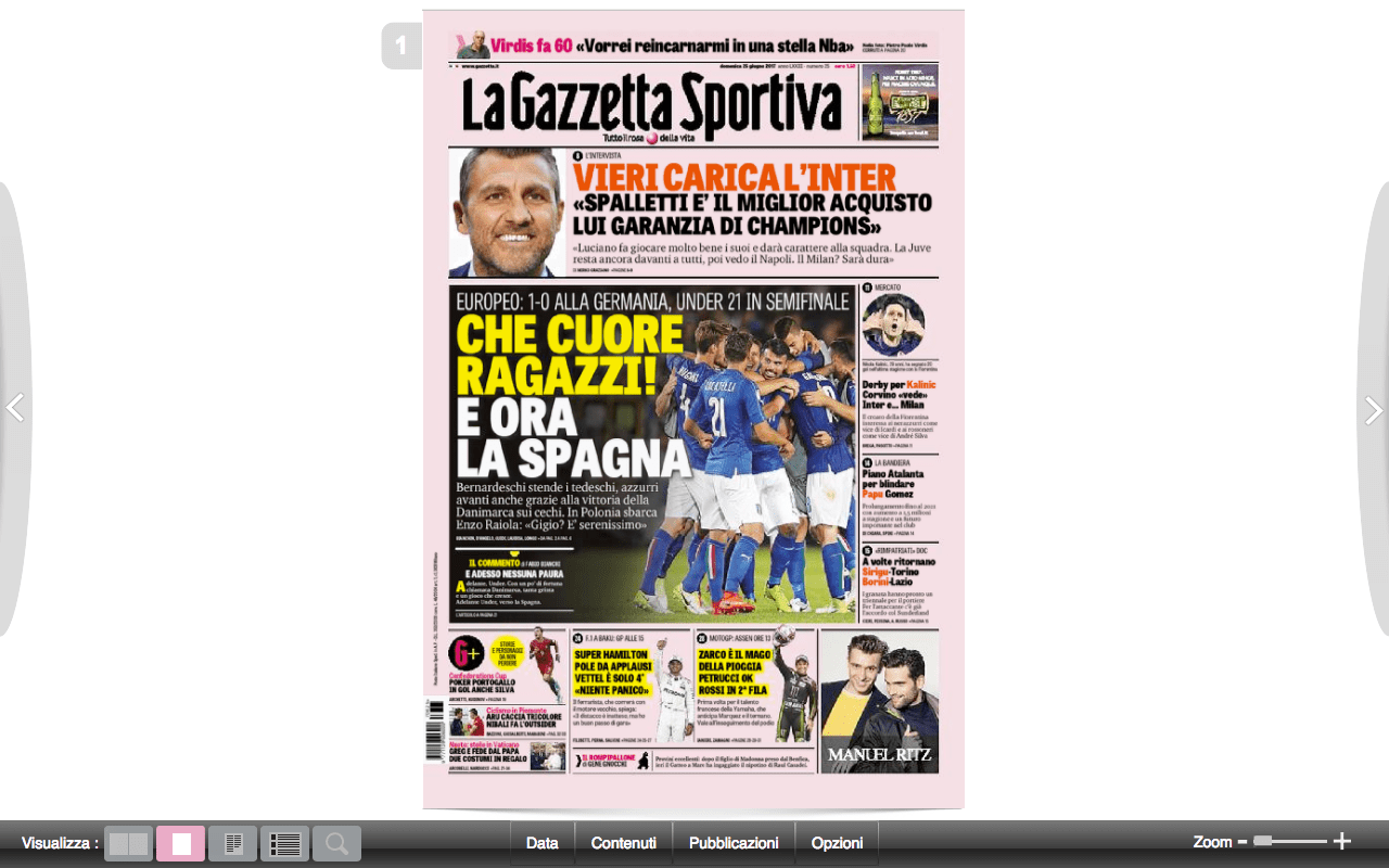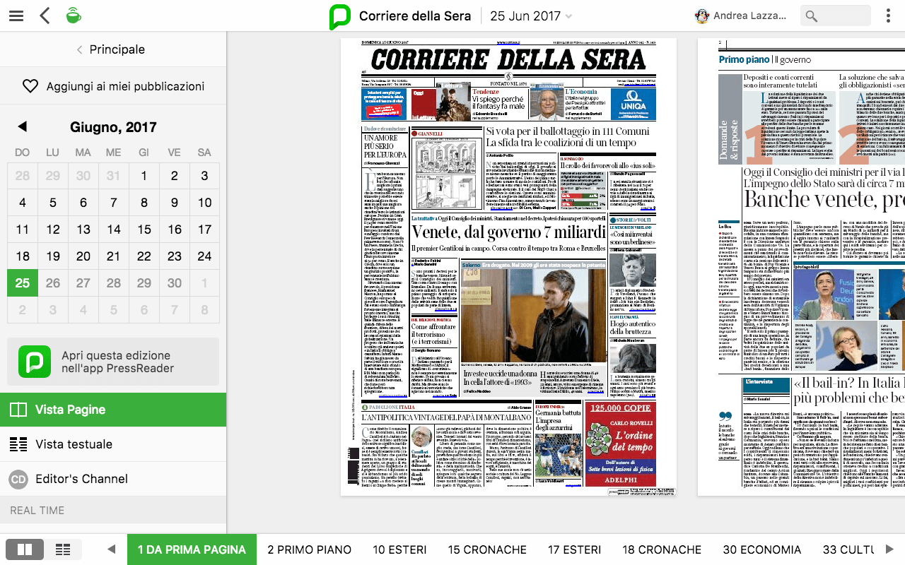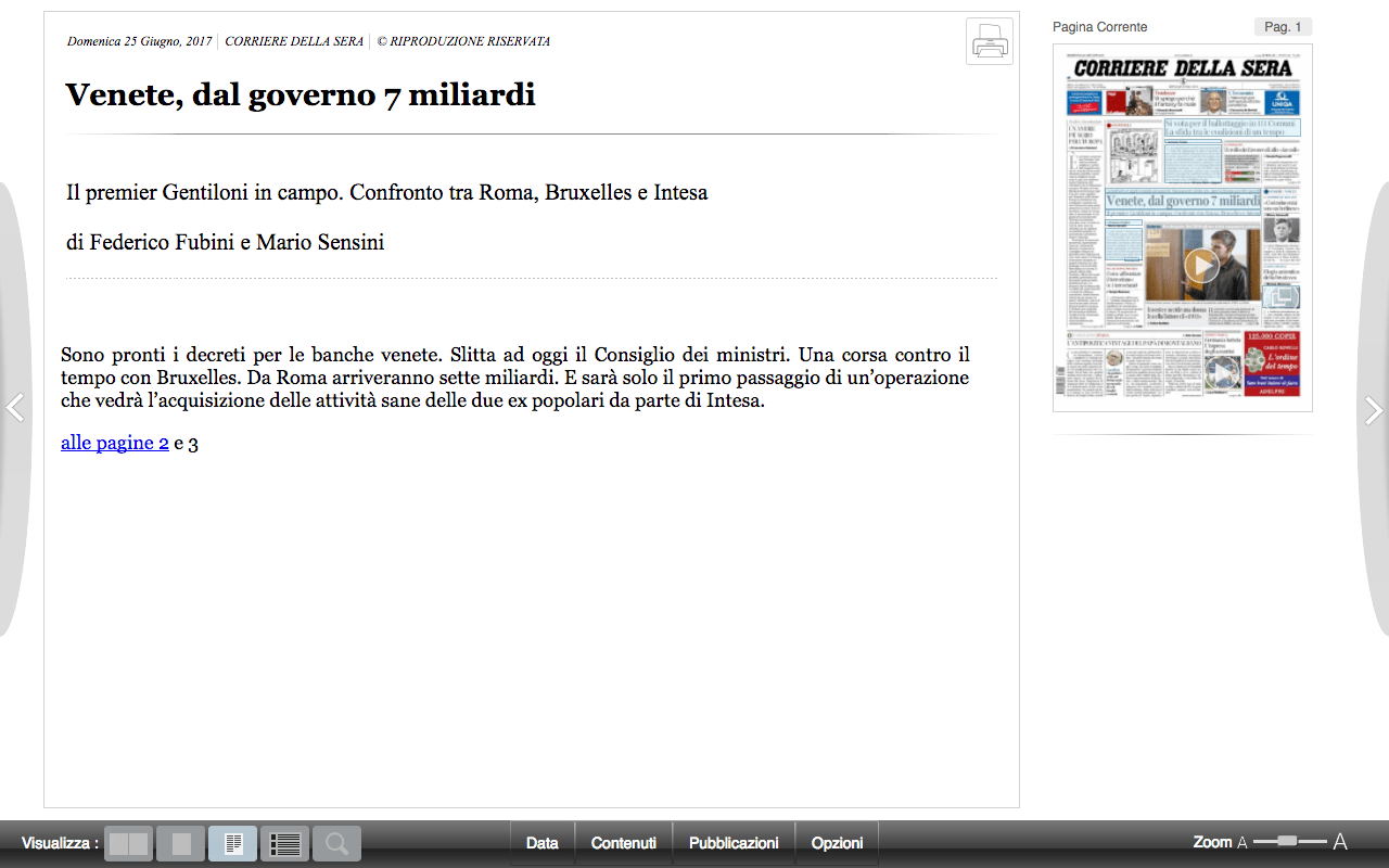 Cliccando sopra a una testata si apre la visualizzazione completa delle pagine e poi è possibile passare anche al testo degli articoli mostrato come se fosse un blog. Nelle figure seguenti trovate un esempio di entrambe le viste.